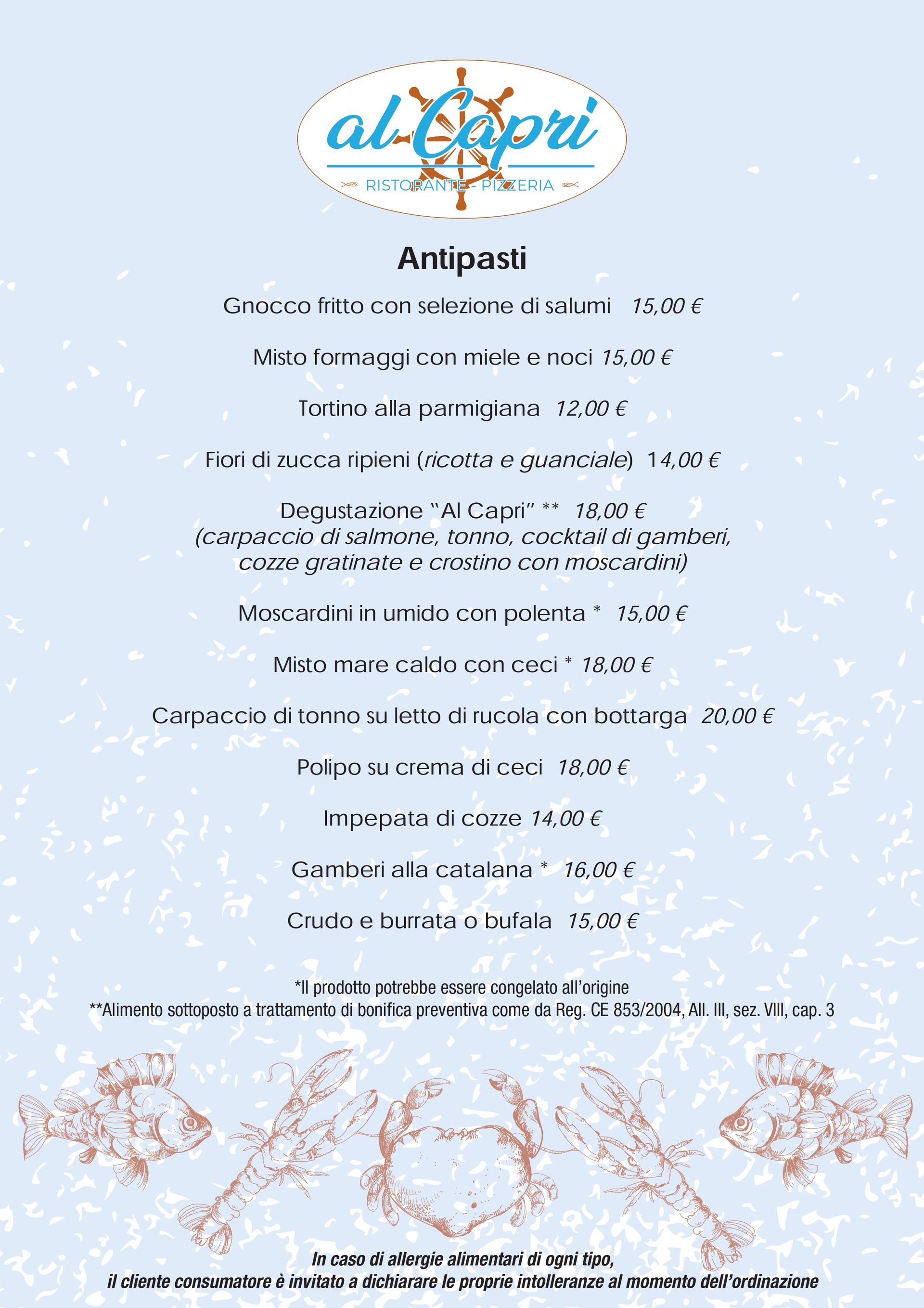 Proponiamo antipasti degustazione con prodotti del territorio o crudi di pesce, primi piatti creativi o tradizionali, carne alla griglia, fritto di pesce e molte altre specialità di terra e di mare.